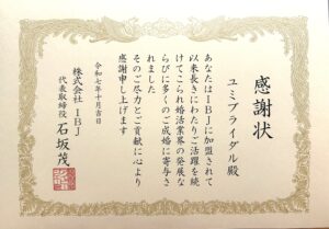 IBJスタッフや協力会社、他相談所の仲人仲間、会員さんをご紹介くださる友人、ユミブライダルスタッフと家族に感謝しています。